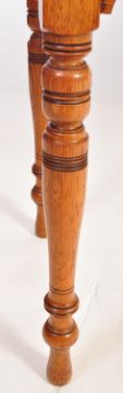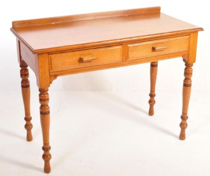 A 19th century Victorian oak 2 drawer writing table having a stub gallery back, chamfered edge to the writing area, tramline turned leg with carved spandrels to the inner corners. Measures approx: 82cm x 107cm x 50cm