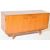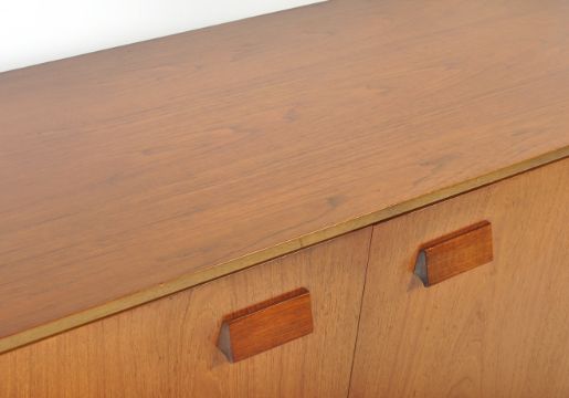 A retro vintage mid 20th century teak wood side board credenza having angular recessed handles two the double door cabinet opening to reveal a shelved interior raised op tapering supports. Measures 72cm x 137cm x 47cm.