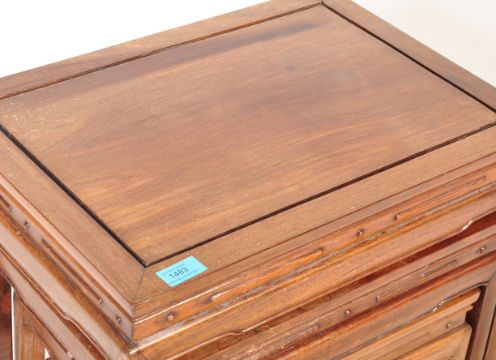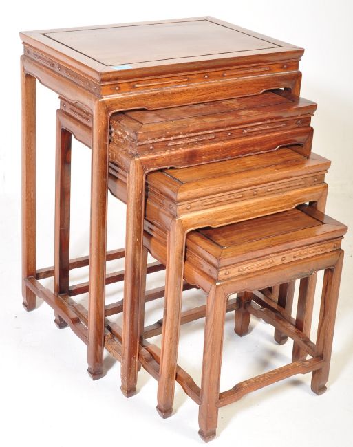 A set of vintage 20th century oak nest of tables of graduating form having carved border to tabletop with  'dot and dash' decoration along the frieze and being raised upon square supports united by stretchers. Measures approx: 70cm x 50cm x 36cm