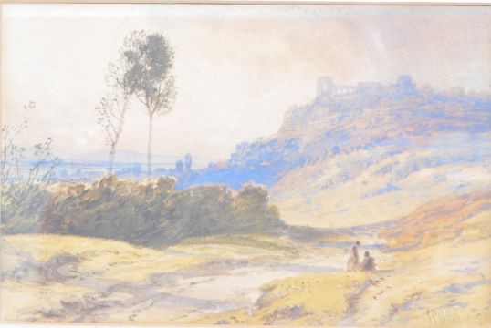 Joseph Paul Pettitt (1812 - 1865) - A 19th century Victorian watercolour painting having of a countryside scene with ruins to the background. Set within gilt framed having foliate decoration to the corners. Framed, mounted and glazed. Measures 42cm x 52cm.