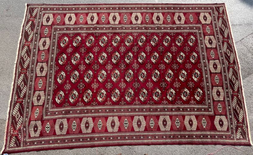 An early 20th century hand knotted Persian Islamic Turkoman floor rug carpet. The rug having a red ground with a series of central lozenges in orange and cream, with further geometric patterns around the border. Measures 390cm x 250cm.