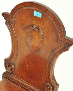 A 19th century Victorian mahogany hall chair having a shaped armorial backrest, panel seat raised on turned legs to the front and sabre legs to the back. Measures 90cm high.