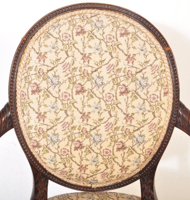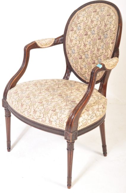 A 20th Century George III manner mahogany armchair / arm chair in the manner of George Hepplewhite having a wheel back circular backrest with floral upholstery seat raised on reeded tapering cylindrical carved legs. Measures; 96cm x 65cm x 51cm.