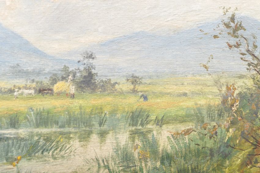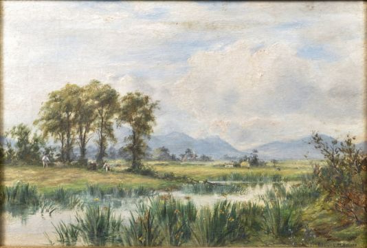 Edward M. Elliott - An early 20th Century oil on canvas painting entitled Wild Iris Sketch Nr Pwllheli. Depicts a landscape scene with pond / ford, trees and buildings to distance under a blue cloudy sky. Signed by artist and dated 1902 with label to verso. Set to a gilt frame. Measures approx; 28cm x 38cm.