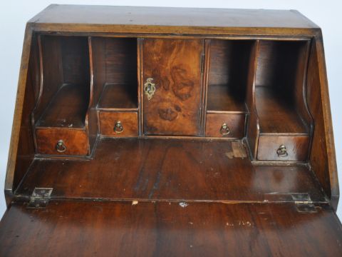 A late 19th Century Victorian Queen Anne revival burr walnut ladies bonheur de jour / writing bureau desk of good small proportions. The bureau having a crossband full front bureau sections enclosing a fully appointed interior set within. Below one small drawer over three graduating drawers below all with brass swing handles and backplates. All raised on bracket feet support. Measures approx; 93cm x 60cm x 46cm.