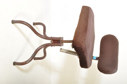 A vintage 20th century office chair with padded back rest and seat united by a brown tubular metal frame and being upholstered in a brown corduroy like fabric. Together with a retro school stool having a shaped oak seat with carry candle over black tubular supports united by stretchers. Measures 77cm x 43cm x 45cm.