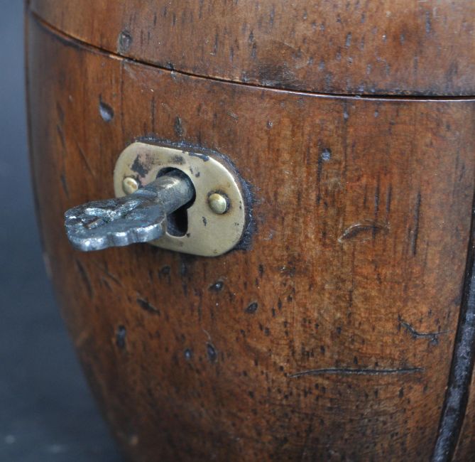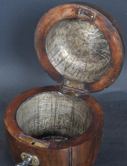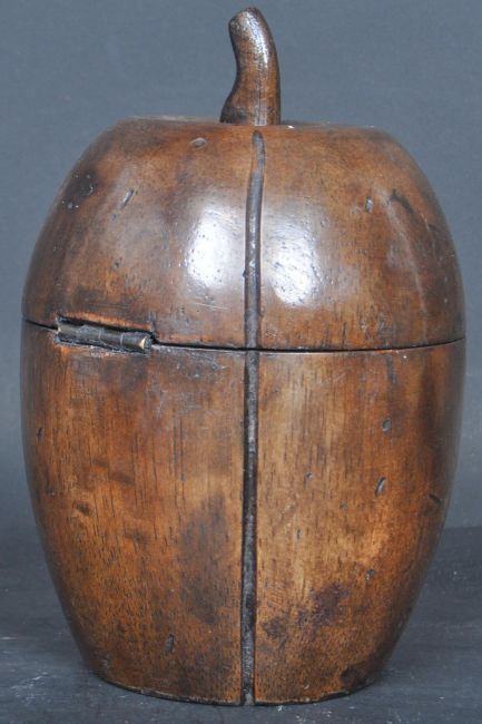 A George III style 20th century fruitwood tea caddy in the form of a cantaloupe melon with grooved decoration and key. Measures 17cm tall.