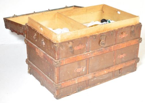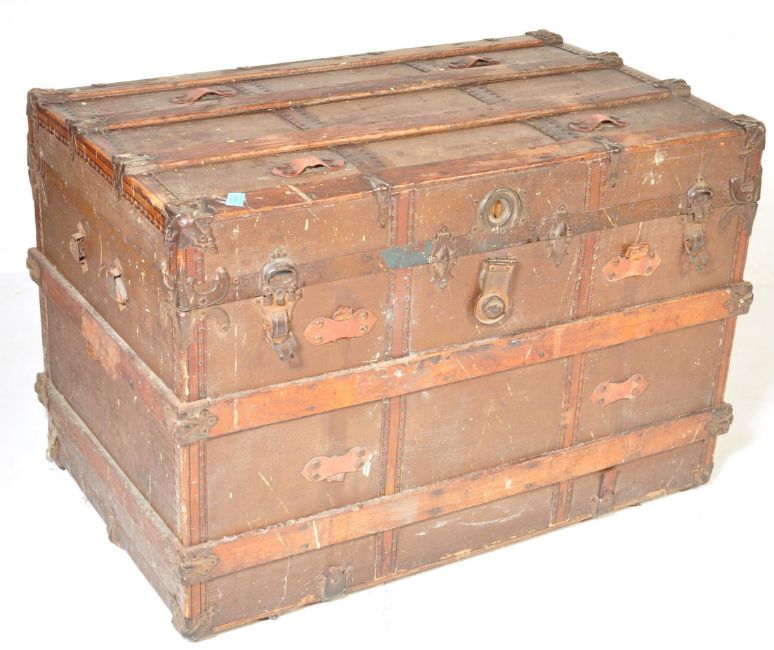 A 19th century Victorian canvas and wooden bound steamer trunk. The trunk being of large oversized form, rectangular construction with hinged top opening to reveal lined interior. Measures approx: 66cm x 99cm x 58cm.