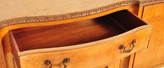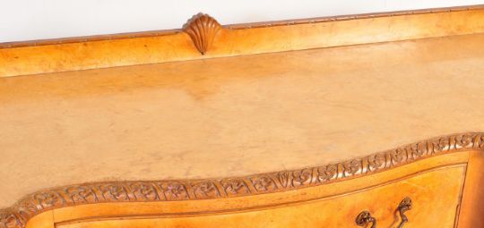 An early 20th century circa. 1950's  Queen Anne style 18th century revival walnut burr inverted breakfront sideboard credenza. The sideboard having a low gallery back with carved shell palmette motif to the centre, over centre section fitted with a bank of three serpentine shaped drawers flanked by end cupboards. All fitted with brass swan neck handles, raised upon carved cabriole legs. Measures 98cm x 166cm x 52cm.