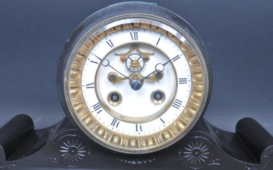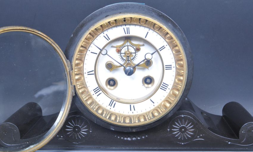Samuel Marti - A 19th century French slate mantle clock having an open escapement white porcelain enamel chapter ring with roman numeral within a gilded gadrooned border. Held within a black slate case having carved concave decoration over a stepped plinth base. Movement marked for Samuel Marti.