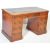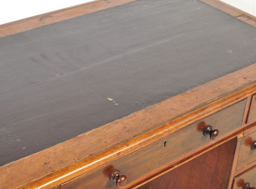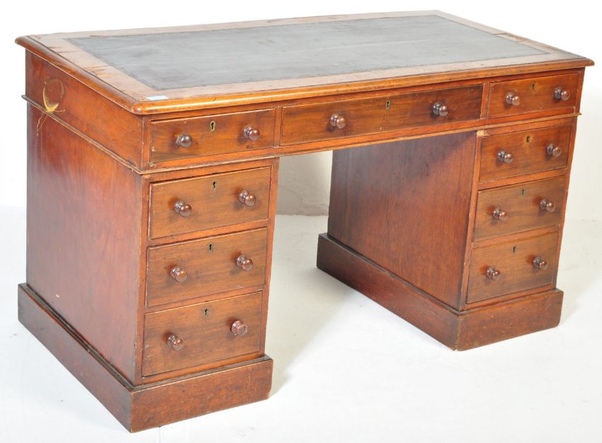 A 19th century Victorian mahogany desk having a brown leather writing skiver to the top, chamfered edge, central kneehole flanked by banks of three drawers with turned handles raised on plinth base. Measures approx: 69cm x 118cm x 60cm