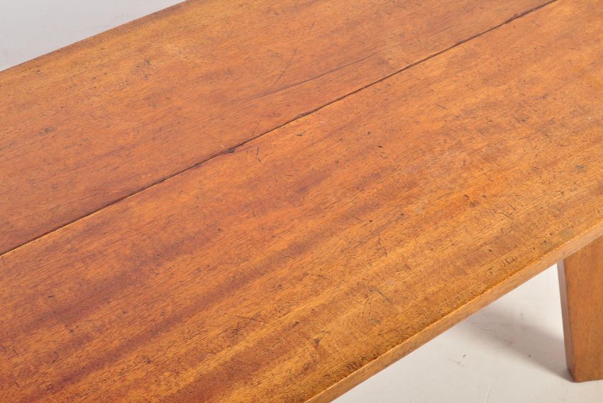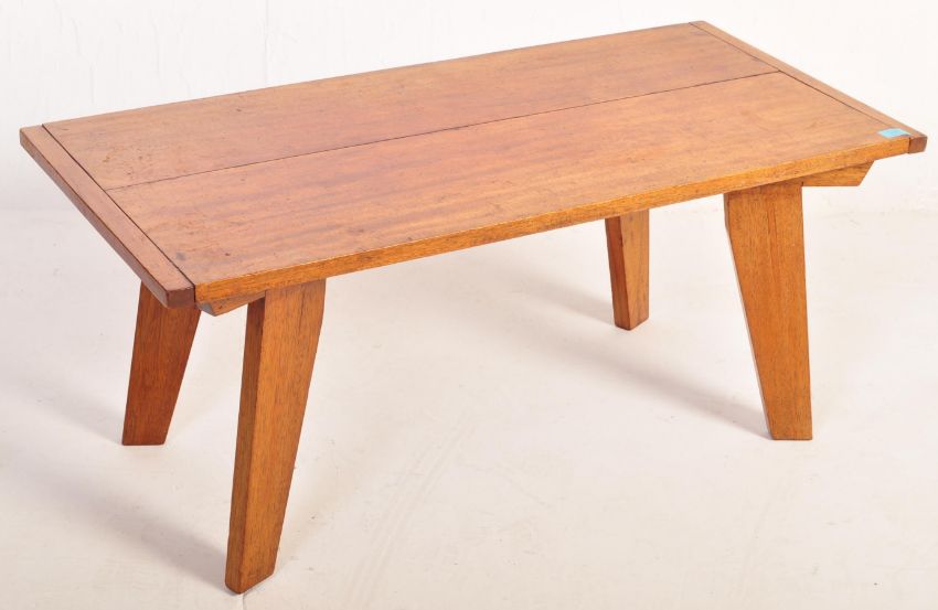 A retro mid 20th century oak coffee occasional table having a rectangular table top raised over angular slat supports. Measures approx: 43cm x 100cm x 47cm