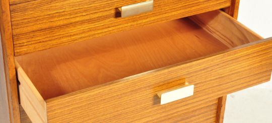 Uniflex - M Range - A retro mid 20th century 1960's teak veneer tall  chest of drawers having a single bank of five drawers, each with rectangular chrome handles raised upon square supports.