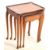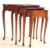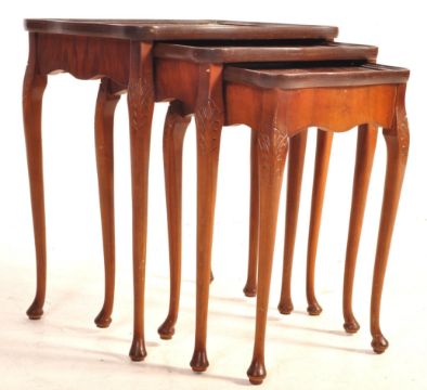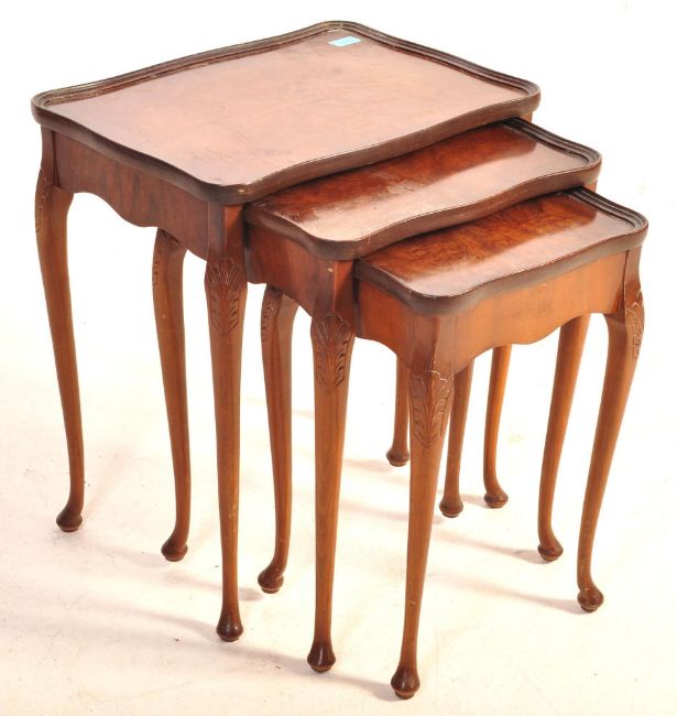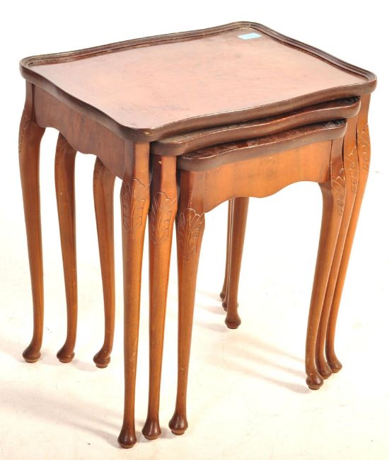 A mid century, circa 1950s Queen Anne revival nest of tables. The tables having a raised serpentine edge, quarter panelled veneered top being raised on cabriole legs with pad feet. Measures approx. 56cm x 49cm x 37cm.