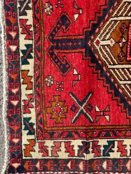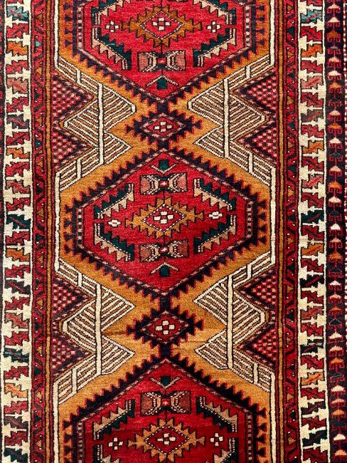 An early 20th century hand knotted Persian Islamic Northwest Iran Heriz floor runner rug carpet. The rug having central ochre ground with central red lozenges and geometric pattern around the edges. Measures 300cm x 105cm.