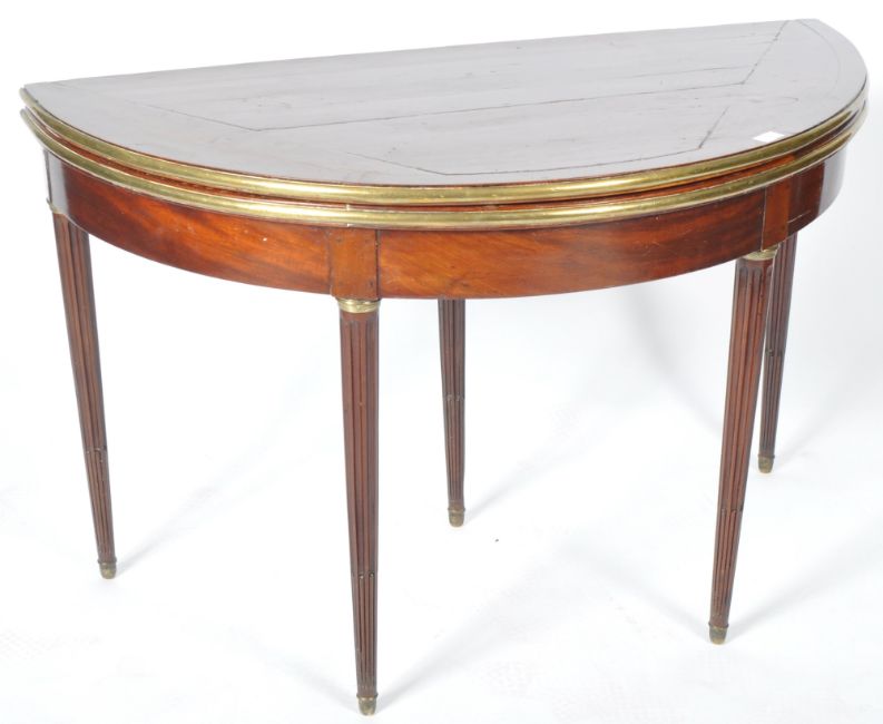 An early 20th Century French Empire mahogany and brass card table / games table of demi lune shape having brass borders to the table top raised on reeded tapering legs mounted with brass rings. Measures approx; 74cm x 115cm x 57cm.