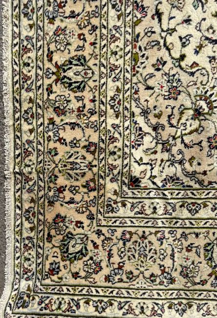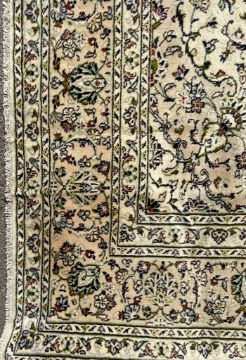 An early 20th century hand knotted Persian Islamic Kashan floor rug carpet. The rug having a cream ground with foliage pattern to centre and the border having floral sprays. Measures 350cm x 246cm.