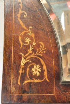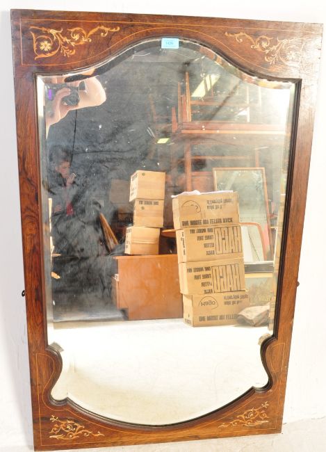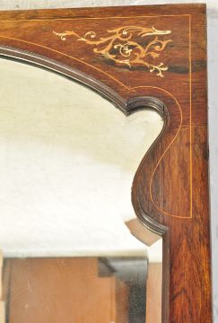 An early 20th century Edwardian Art nouveau rosewood wall hanging mirror having a floral and foliate inlay to the corners and flowing organic shaped to the frame. Measures approx: 111cm x 71cm.