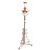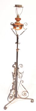 A vintage 20th century ebonised wrought standard lamp / converted oil lamp having a copper reservoir, scrolled detailing single column support raised on a tripod base. Measures approx: 160cm x 50cm x 57cm.