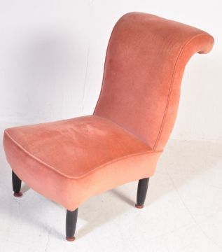 A retro vintage mid 20th century boudoir / salon / nursing chair having a scrolled back rest, upholstered in pink velour fabric raised on ebonised tapering legs. Measures approx: 45cm x 105cm x 43cm