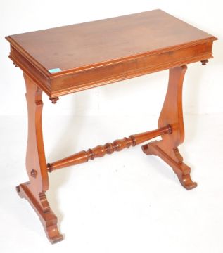 19th century Victorian mahogany side table desk being raised on lyre shaped supports with stretcher uniting. Rectangular top above.