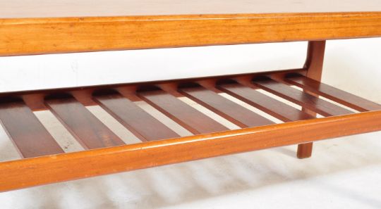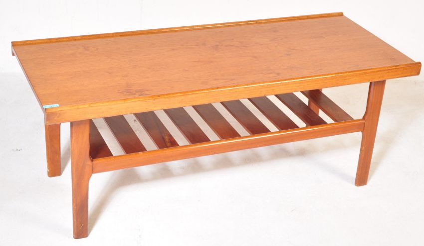 A vintage retro mid 20th century teak coffee table having a rail magazine rack under tier. Measures approx: 45cm x 111cm x 45cm