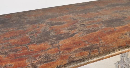 A 19th century Victorian Coalbrookdale manner garden table having a rectangular treated pine table top with curved edges raised upon a decorative white cast iron trestle united by a bar stretcher. measures approx: 76cm x 122cm x 57cm