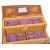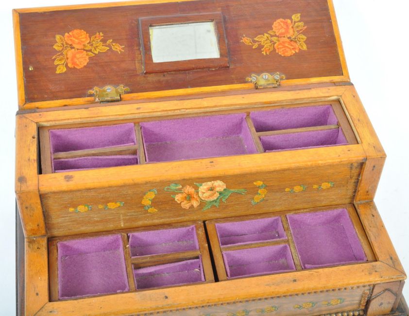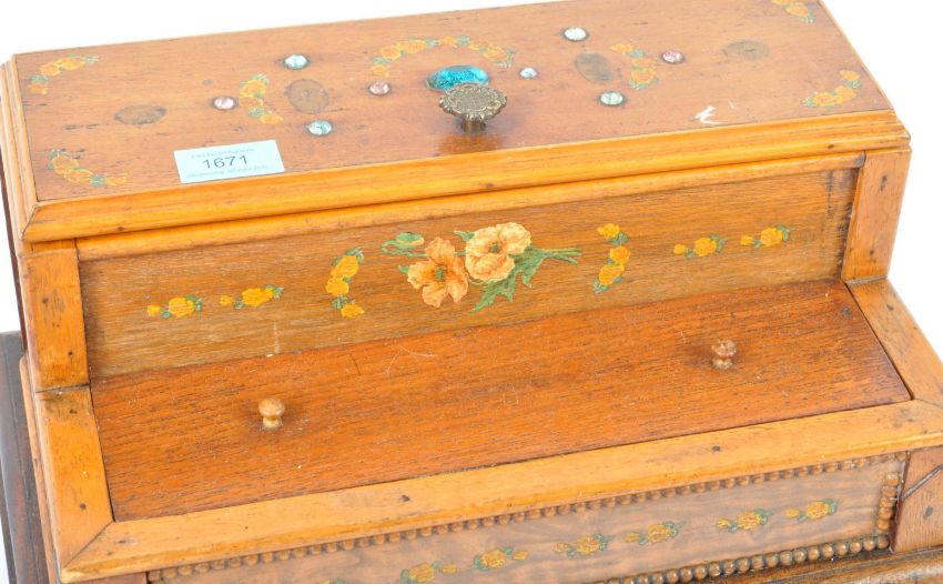 A vintage 20th century oak desk tidy having fitted interior with studded decoration and inset jewel and transfer floral motifs to the top.