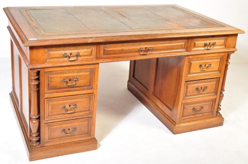 A 19th century Victorian era French walnut twin pedestal desk. The desk comprising of a desk top with green leather skiver with gilt Greek key border and twin drawers beneath each with brass swan neck handles. Raised upon two supports with turned baluster column set within over a stepped plinth base to each. Measures approx: 77cm x 149cm x 90cm