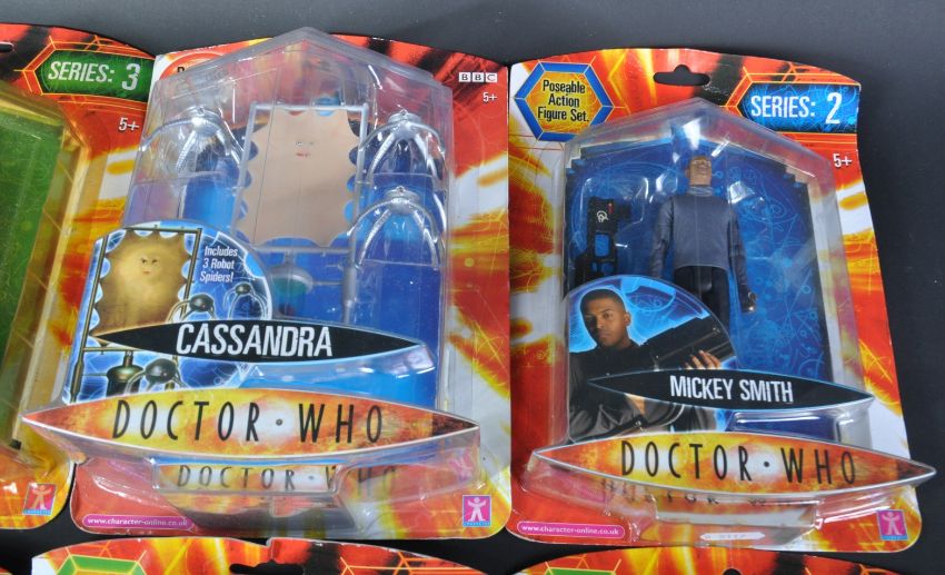 Doctor Who - Character Options - a collection of x10 Character made Doctor Who Series 1-3 carded action figures, including; Mickey Smith, Dalek Thay, Cassandra, Cyberman, Brannigan, Scarecrow and others. Contents all mint and unused, packaging in various conditions but none opened.