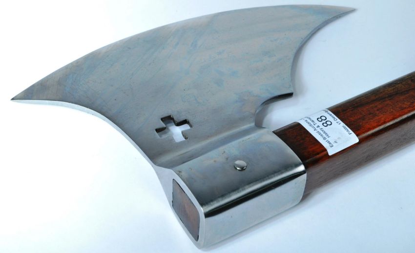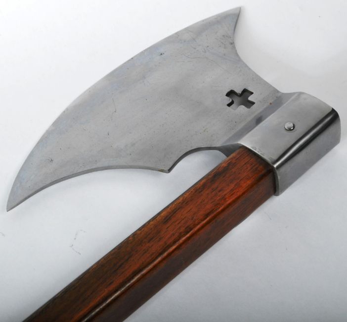 A 20th Century re-enactment battle axe having a crescent axe head pierced with a cross and mounted onto a solid hardwood handle. Measures approx 90cm.