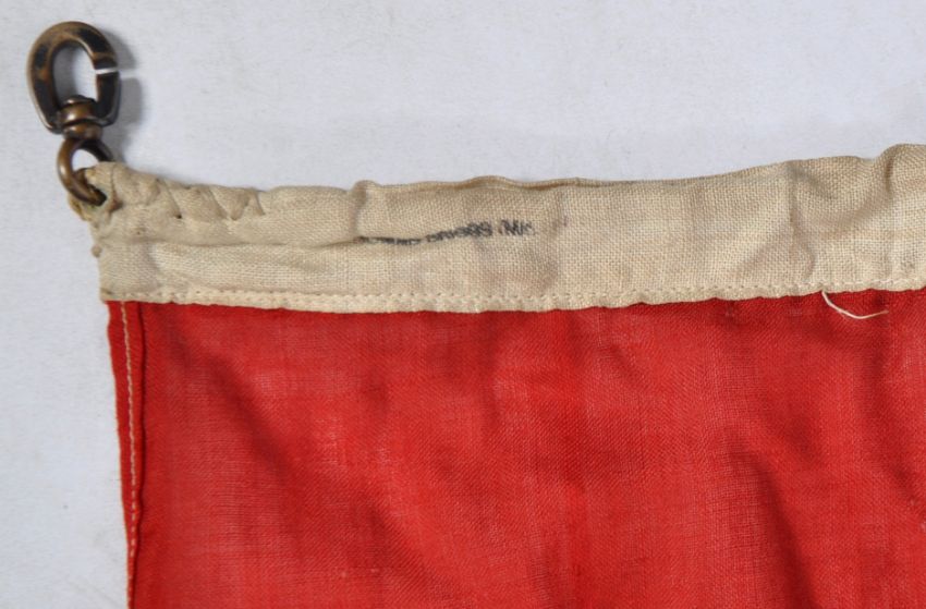WWII Second World War Interest - a 20th century large ship's Royal Navy related pennant / signal flag. Linen construction, the seam marked with maker's marks for Thomas Briggs and further stamped ' 547 '. Red and white, with an additional (faded) Union Flag stitched to the centre. Measures approx; 66cm x 230cm. History unknown.