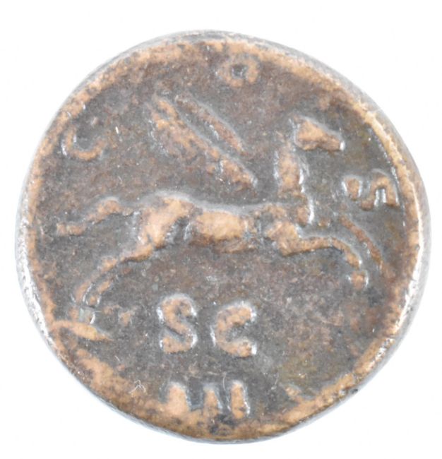 A 2nd century Roman brass dupondius coin of Emperor Hadrian AD117 - 138. Text reads IMP CAESAR TRAIANUS HADRIANUS. To the reverse Pegasus about to take flight. Coin circa 126AD.