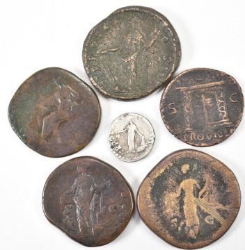 A collection of ancient Roman coins comprising of Vespasian copper As, Antoninus Pius sestertius x 2 Antoninus Pius silver denarius & Antoninus Pius sestertius X2 coins.