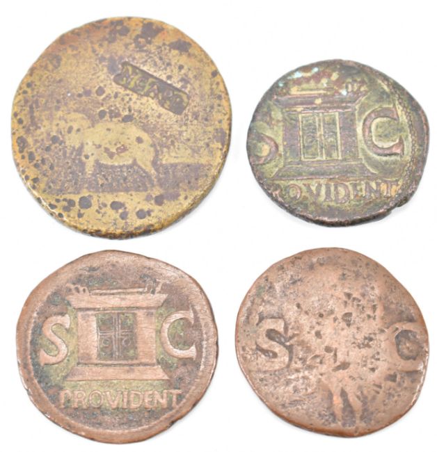 A collection of four Roman Imperial coins from the reign of Tiberius Divus Tiberius AD14-37AD. Collection includes copper As x 3 & a copper Sestertius.