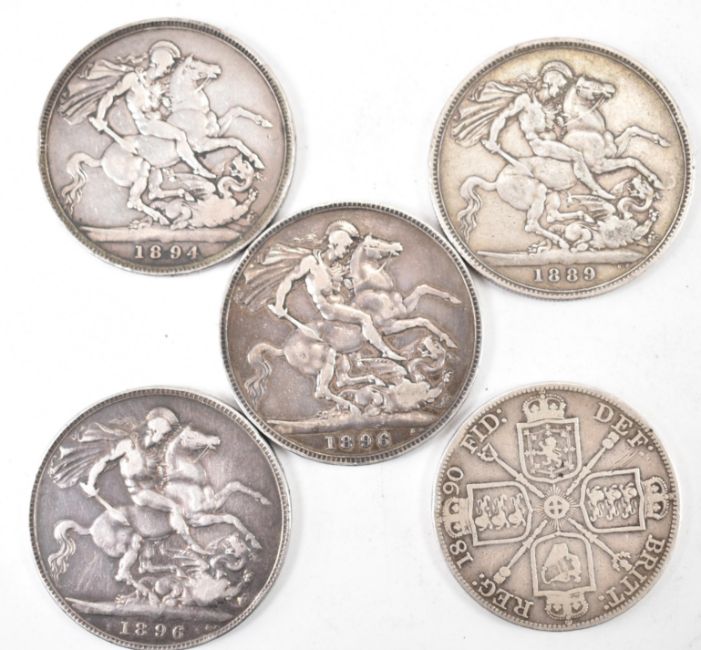 A collection of 19th century Victorian .925 sterling silver coins comprising of a 1890 double florin, 1889 crown, 1894 crown, 1896 crown x 2. Gross weight 135.13g.