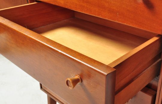 Minty - A vintage retro mid 20th century circa. 1960's teak wood sideboard credenza. The sideboard having a bank of four drawers aside a twin door cupboard opening to reveal a shelved interior, each having turned wood handles. Raised on tapering square supports.