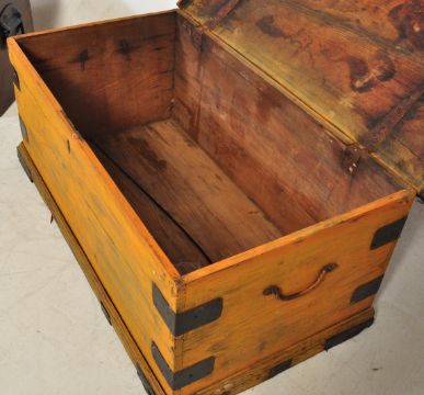 A collection of three early 20th century and later wooden chests to include a chest with stencilled lettering for an Edwin Hale Bradenstoke, a pine brass mounted trunk and another. Measures 33 x 77 x 32cm.