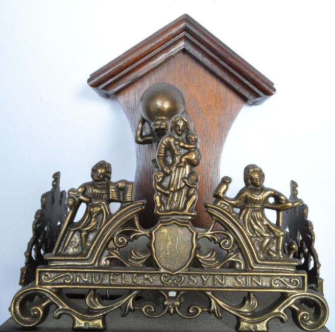 A 20th century small Dutch frieze ''Nu Elck Syn Sin'' wall clock, the arched cornice surmounted by brass diorama finial above a silvered dial with fretted brass hands flanked by brass barley twist columns and detailing. With two weights and pendulum. Measures approx. 52cm x 20cm x 13cm