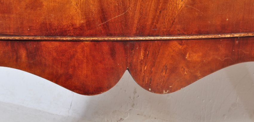 A 20th century Regency Revival mahogany sideboard credenza. The sideboard having serpentine facade with cross banding to top over two central drawers flanked by two cupboards, each having hoop handles with moulded flower motifs. Raised upon reeded tapering supports. Measures 93 x 161 x 48cm.