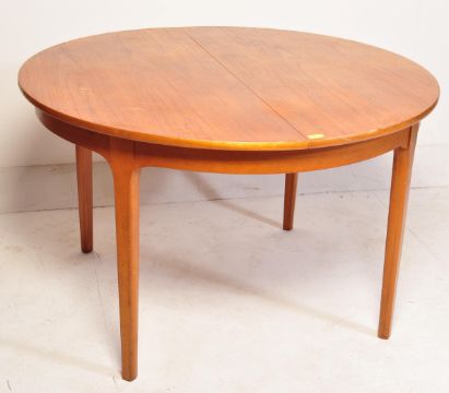 Nathan - British Modern Design - A retro vintage mid 20th century extendable teak dining table. The table of circular form has an extra leaf and is raised on tapering supports. Measures 75 x 168 x 122cm.
