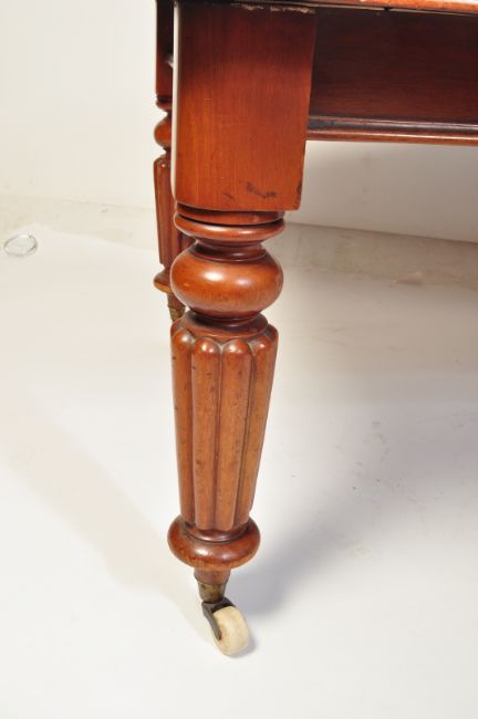 A 19th century Victorian mahogany extendable dining table having chamfered edge raised on reeded legs atop castors. Comes with extra leaf.