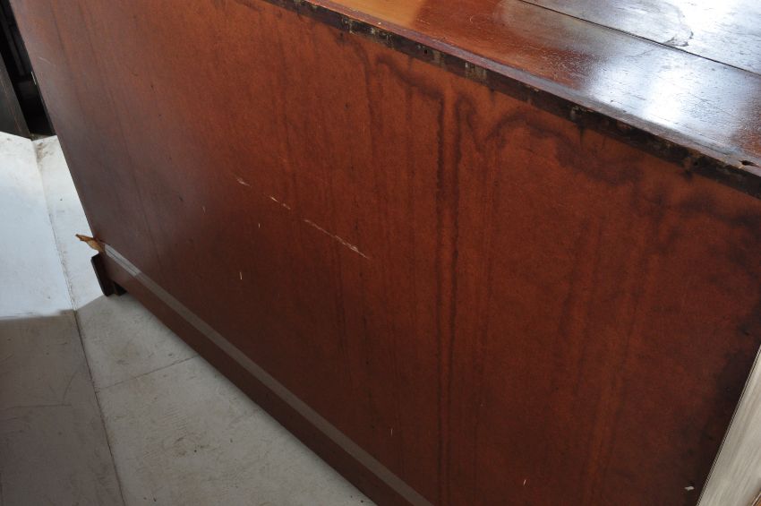 An early 20th century Art Nouveau Edwardian mahogany sideboard credenza having having a flared top over a run of three drawers atop three single door cupboards raised on a plinth base. Measures 100 x 152 x 55cm.