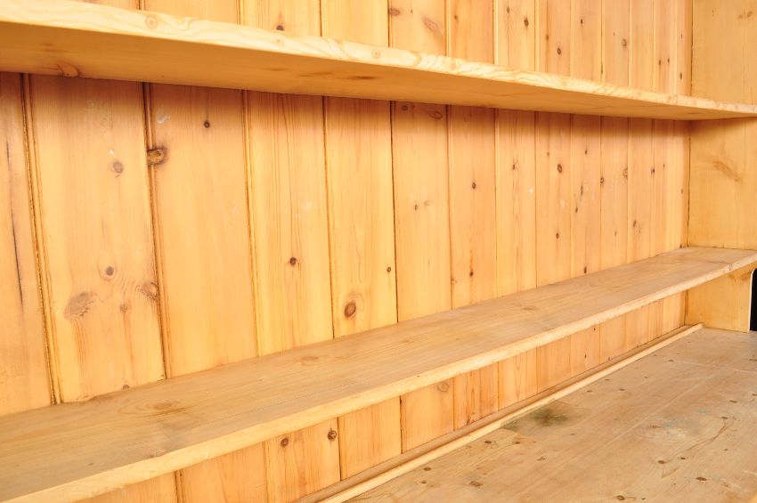 A large 20th century country pine Welsh kitchen dresser having a flared top over a three tiered plate rack atop a dresser base. The base having a run of four drawers over four single door cabinets opening to reveal shelved interior raised on a plinth base. Measures 214 x 235 x 54cm.