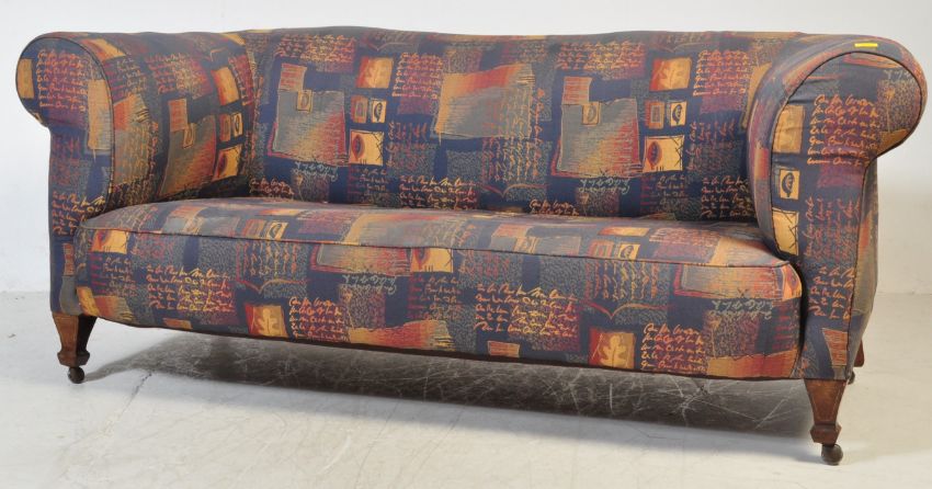 Late 19th century Victorian oak chesterfield  sofa settee. Raised on stub tapering legs with later castors having barrel arms and back rest.  Upholstered in a late 20th century fabric cover. Measures 75 x 189 x 106cm.