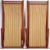 Two retro vintage 20th century folding deck chairs having wooden folding frames with pinstripe canvas fabric seats.