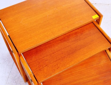 A vintage retro mid 20th century teak nets of tables of graduating size. Each having floating tops and being raised upon arched bases in the manner of the Nathan Burlington range. Measures approx: 43x59x37cm