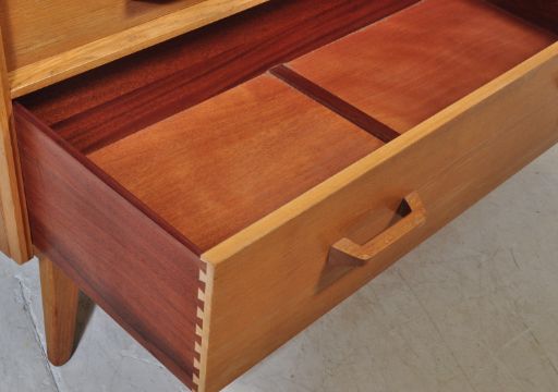 E. Gomme- G Plan - Brandon Range - A retro vintage 20th Century light oak dressing table chest having a central mirror panel to centre. The top with recessed drop centre flanked by drawers. All being raised on splayed tapering supports. Measures 144 x 107 x 50cm.