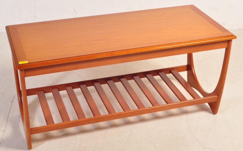 G Plan - A retro 20th Century teak coffee table having a chamfered edge rectangular top with slatted magazine rack under tier. Label present. Measures 52 x 110 x 50cm.