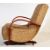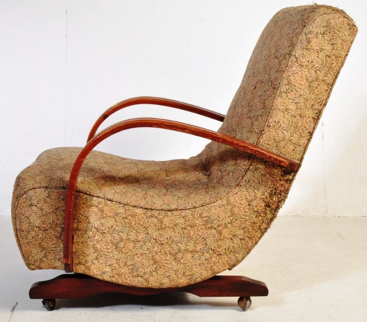 An early 20th century Art Deco circa 1930s " Banana " bentwood rocking chair upholstered in period fabric. The chair having curved elbow rests raised on a wooden support and castors. The chair having a lever to the right in order to recline to the seat. Measures approx: 89x67x95cm